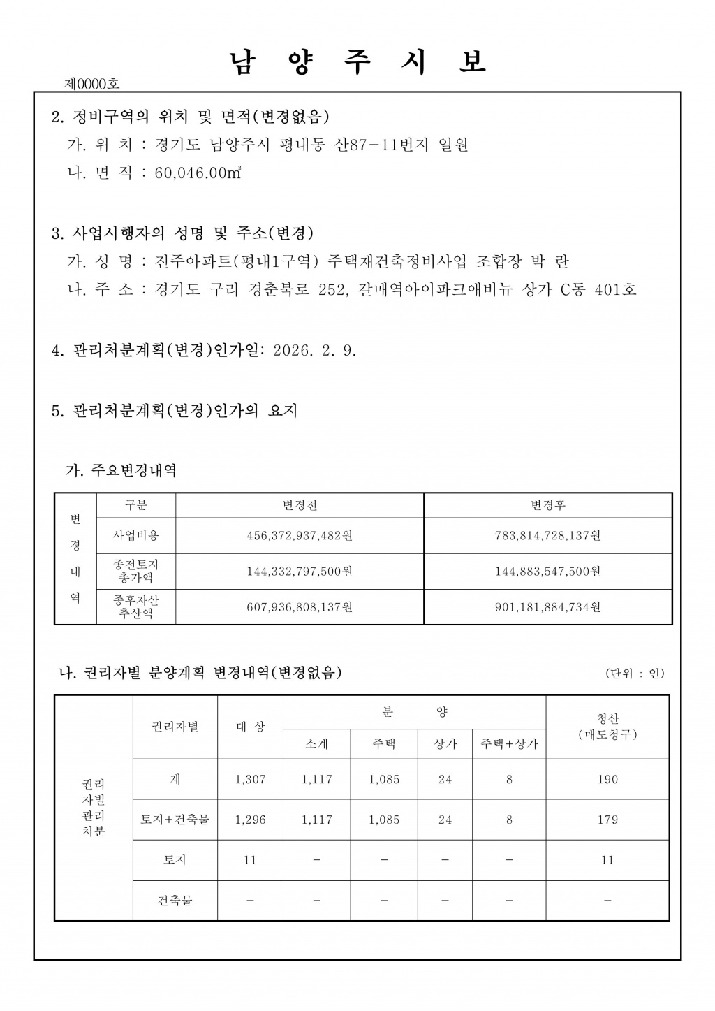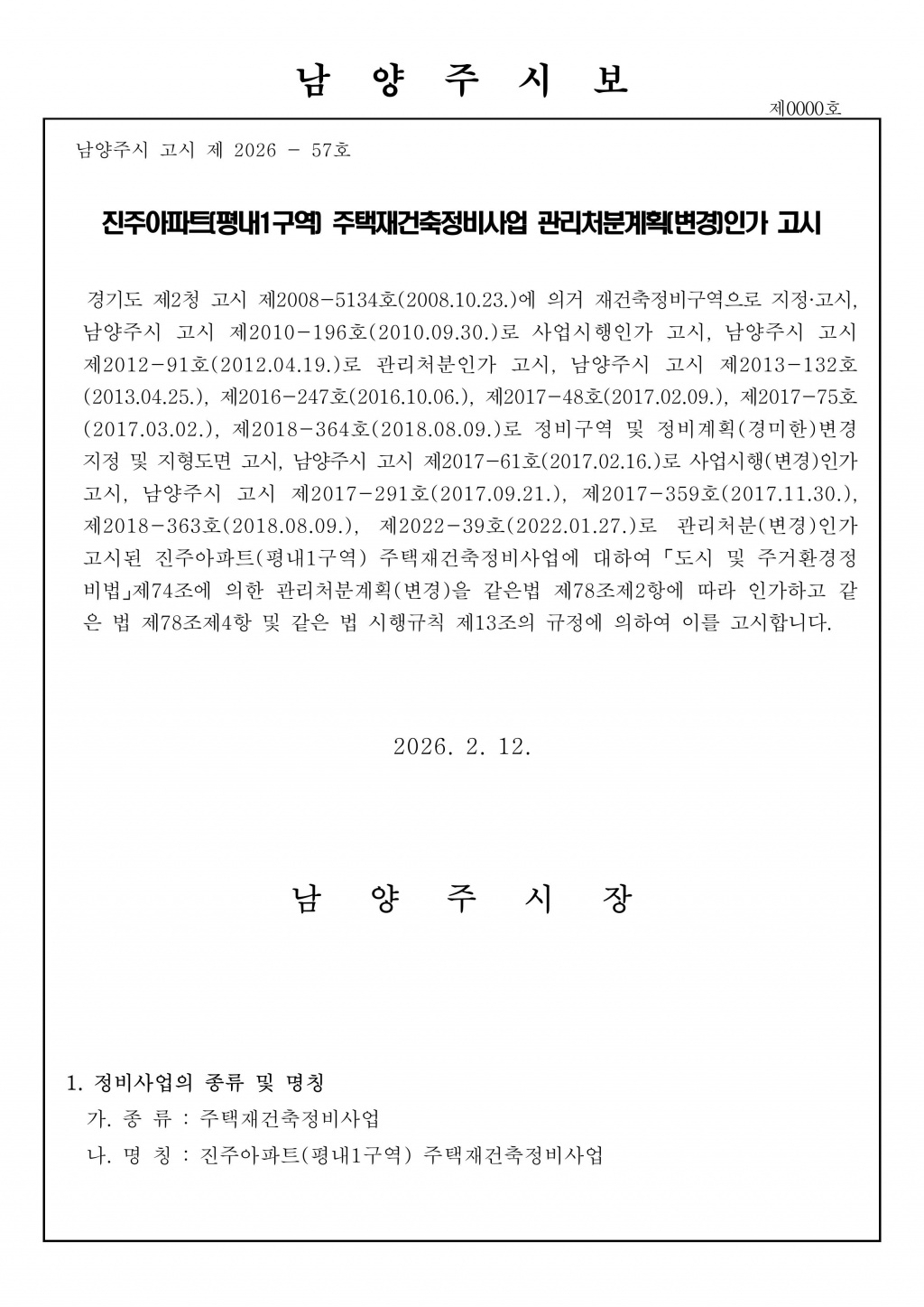 평내1구역 관리처분계획(변경)인가 고시문 페이지 정보 조회 204회 작성일 2026-02-12 16:05 URL http://www.jjapt-union.com/notice/35 목록 본문 -